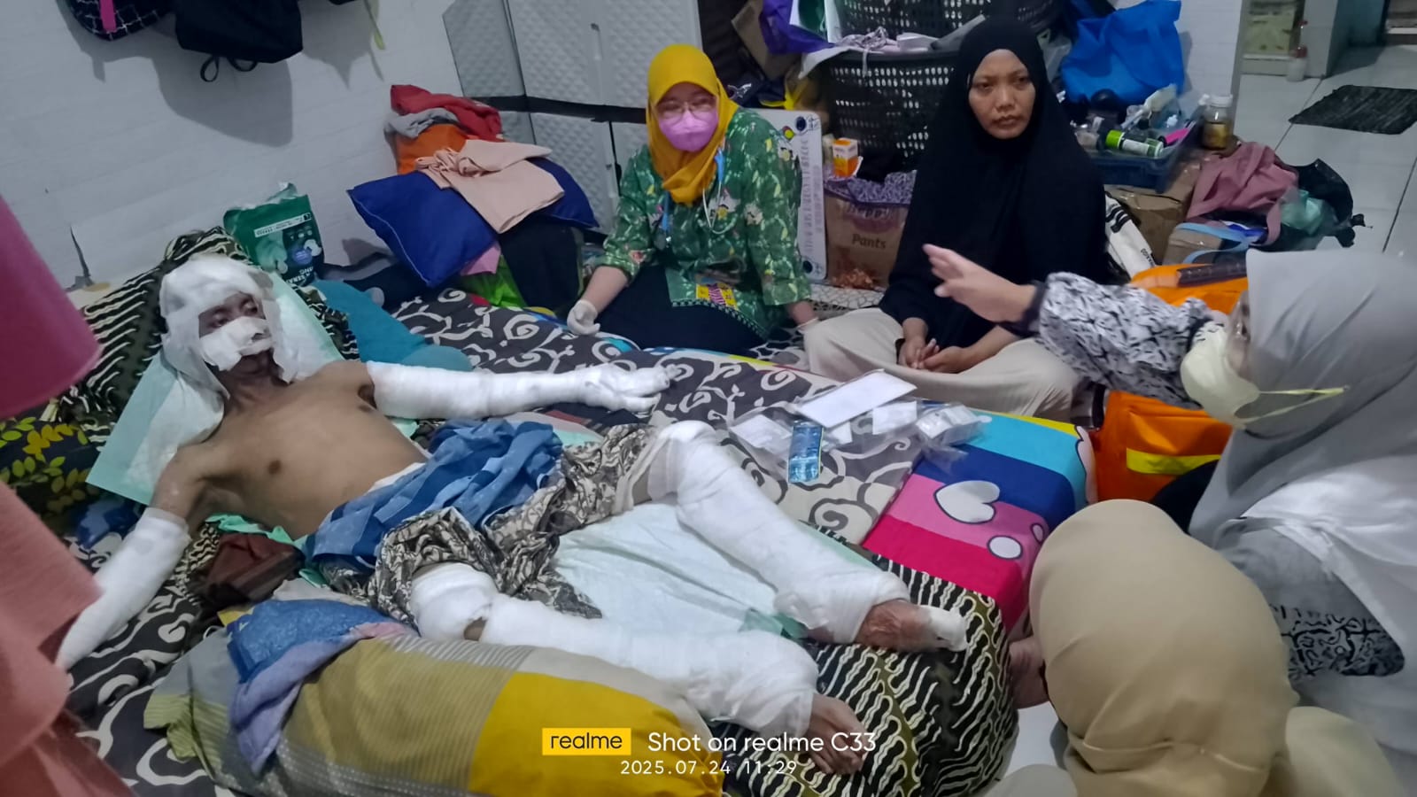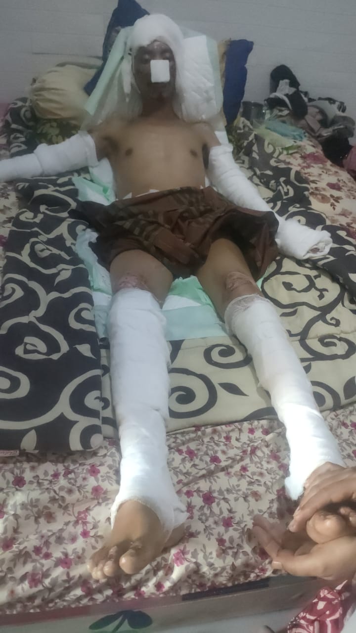 Pak Syamsudin (44), kini hanya bisa terbaring tak berdaya, diliputi rasa perih yang menusuk dan sangat intens, setiap inci jaringan kulitnya yang rusak. Dokter mengatakan luka bakarnya berisiko tinggi terkena infeksi. Bahkan, Ia mulai menunjukkan tanda kekurangan gizi karena tak sanggup makan.